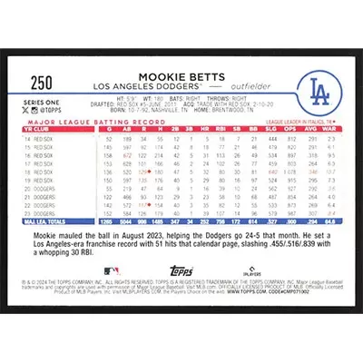 This is a 2024 Topps Mookie Betts baseball card. The card is #250 and pictures show condition.