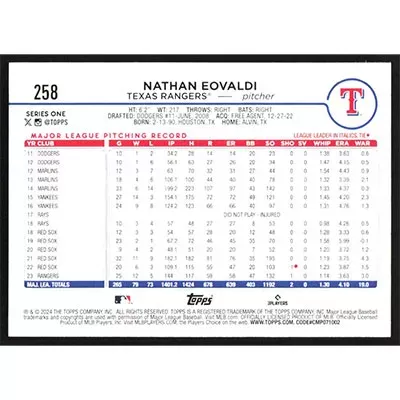 This is a 2024 Topps Nathan Eovaldi baseball card. The card is #258 and pictures show condition.