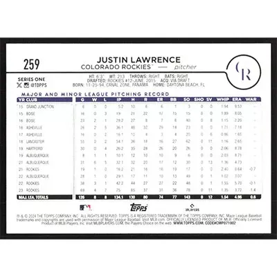 This is a 2024 Topps Justin Lawrence baseball card. The card is #259 and pictures show condition.