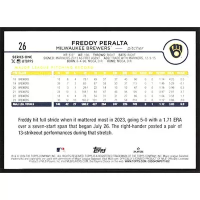 This is a 2024 Topps Freddy Peralta baseball card. The card is #26 and pictures show condition.