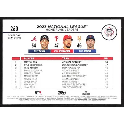 This is a 2024 Topps Matt Olson, Kyle Schwarber and Pete Alonso League Leaders baseball card. The card is #260 and pictures show condition. Team(s): Atlanta Braves/Philadelphia Phillies/New York Mets