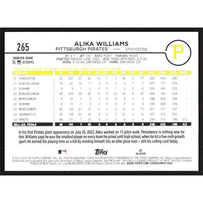 This is a 2024 Topps Alika Williams baseball card. The card is #265 and pictures show condition.