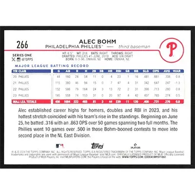 This is a 2024 Topps Alec Bohm baseball card. The card is #266 and pictures show condition.