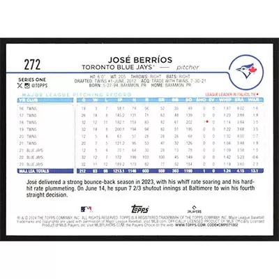 This is a 2024 Topps Jose Berrios baseball card. The card is #272 and pictures show condition.