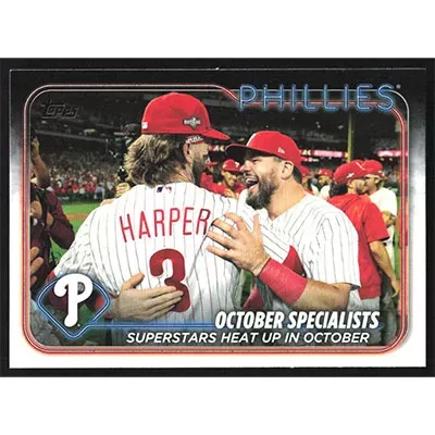 This is a 2024 Topps Bryce Harper and Kyle Schwarber Checklist baseball card. The card is #275 and pictures show condition. Team(s): Philadelphia Phillies