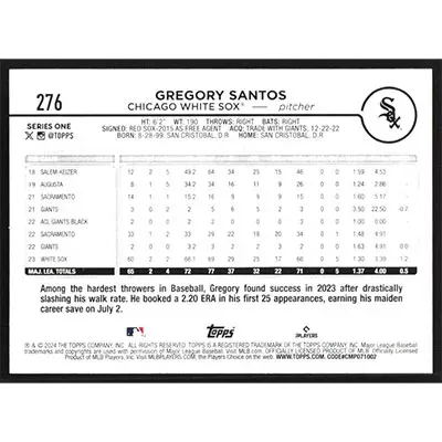 This is a 2024 Topps Gregory Santos baseball card. The card is #276 and pictures show condition.