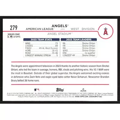 This is a 2024 Topps Los Angeles Angels baseball card. The card is #279 and pictures show condition.