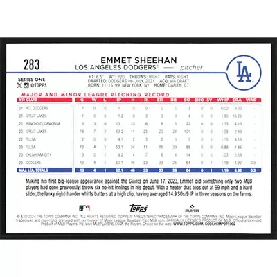 This is a 2024 Topps Emmet Sheehan baseball card. The card is #283 and pictures show condition.