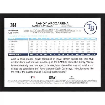 This is a 2024 Topps Randy Arozarena baseball card. The card is #284 and pictures show condition.