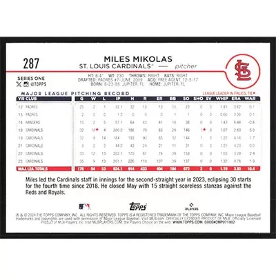 This is a 2024 Topps Miles Mikolas baseball card. The card is #287 and pictures show condition.