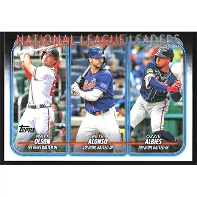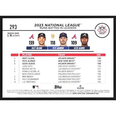 This is a 2024 Topps Matt Olson, Pete Alonso and Ozzie Albies League Leaders baseball card. The card is #293 and pictures show condition. Team(s): Atlanta Braves/New York Mets