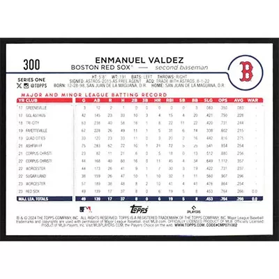 This is a 2024 Topps Enmanuel Valdez baseball card. The card is #300 and pictures show condition.