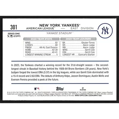 This is a 2024 Topps New York Yankees baseball card. The card is #301 and pictures show condition.