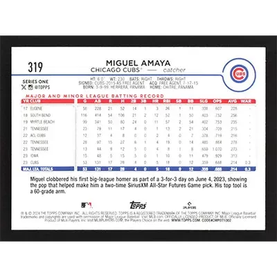 This is a 2024 Topps Miguel Amaya baseball card. The card is #319 and pictures show condition.