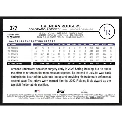 This is a 2024 Topps Brendan Rodgers baseball card. The card is #322 and pictures show condition.