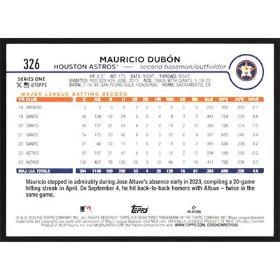 This is a 2024 Topps Mauricio Dubon baseball card. The card is #326 and pictures show condition.