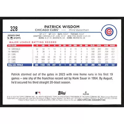 This is a 2024 Topps Patrick Wisdom baseball card. The card is #328 and pictures show condition.