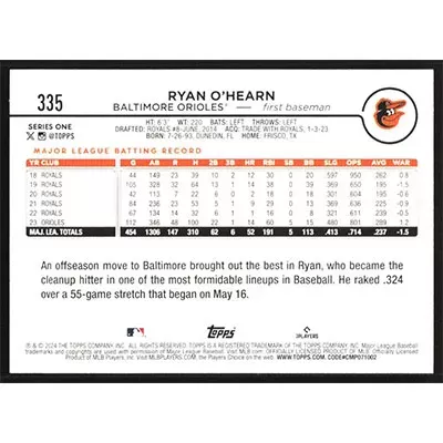 This is a 2024 Topps Ryan O'Hearn baseball card. The card is #335 and pictures show condition.