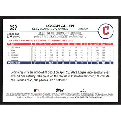 This is a 2024 Topps Logan Allen baseball card. The card is #339 and pictures show condition.
