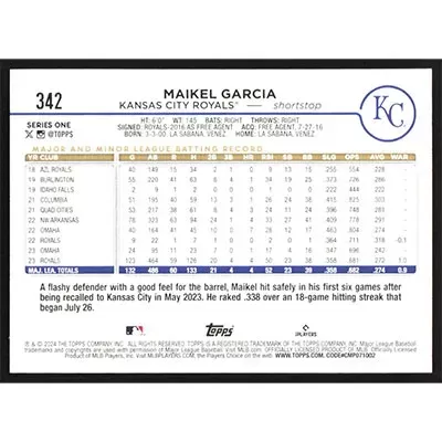 This is a 2024 Topps Maikel Garcia baseball card. The card is #342 and pictures show condition.
