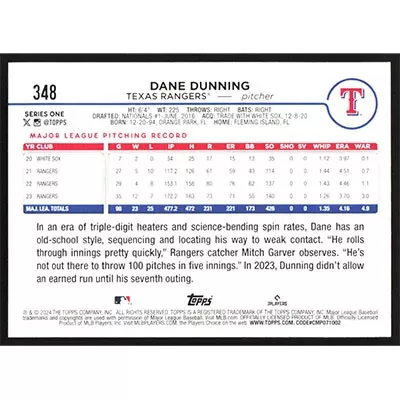 This is a 2024 Topps Dane Dunning baseball card. The card is #348 and pictures show condition.