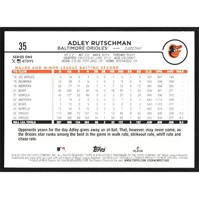 This is a 2024 Topps Adley Rutschman baseball card. The card is #35 and pictures show condition.
