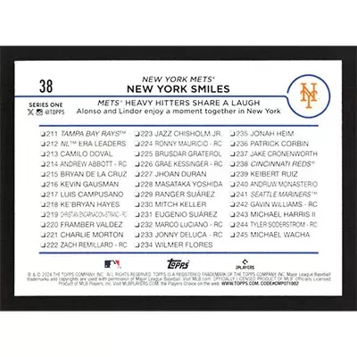 This is a 2024 Topps Pete Alonso and Francisco Lindor Checklist baseball card. The card is #38 and pictures show condition.