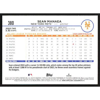 This is a 2024 Topps Sean Manaea baseball card. The card is #380 and pictures show condition.