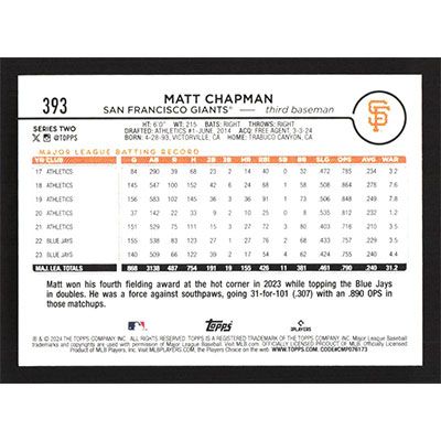 This is a 2024 Topps Matt Chapman baseball card. The card is #393 and pictures show condition.