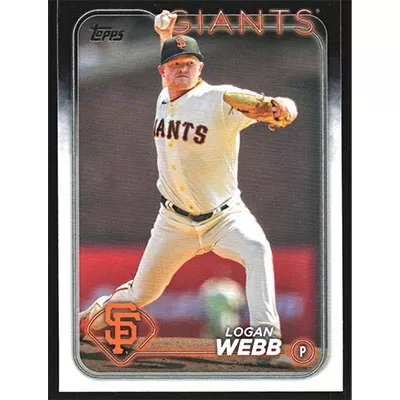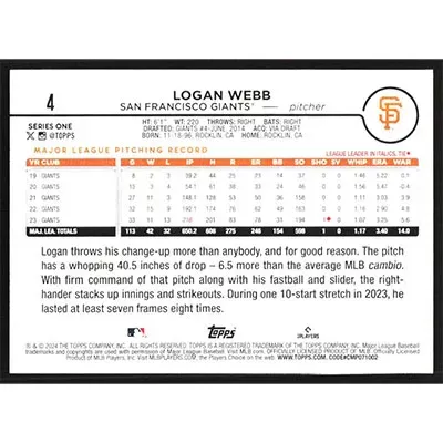 This is a 2024 Topps Logan Webb baseball card. The card is #4 and pictures show condition.