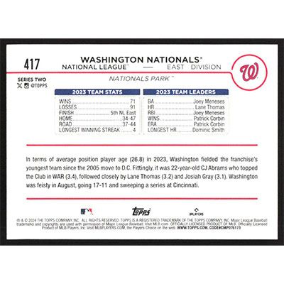 This is a 2024 Topps Team Card baseball card. The card is #417 and pictures show condition.