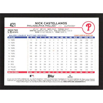 This is a 2024 Topps Nick Castellanos baseball card. The card is #421 and pictures show condition.