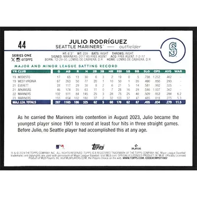This is a 2024 Topps Julio Rodriguez baseball card. The card is #44 and pictures show condition.
