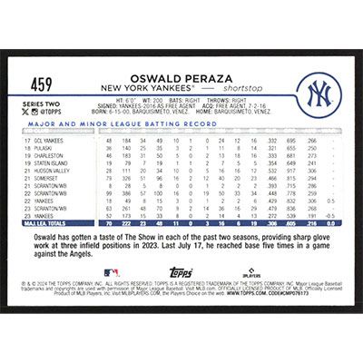 This is a 2024 Topps Oswald Peraza baseball card. The card is #459 and pictures show condition.