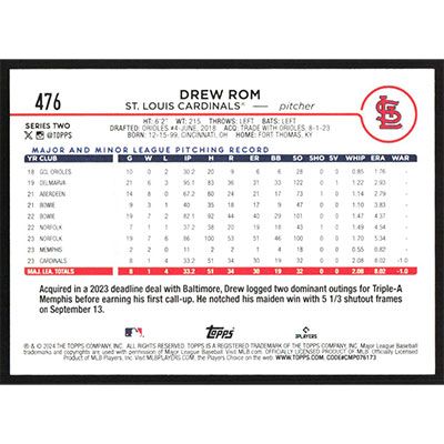This is a 2024 Topps Drew Rom baseball card. The card is #476 and pictures show condition.