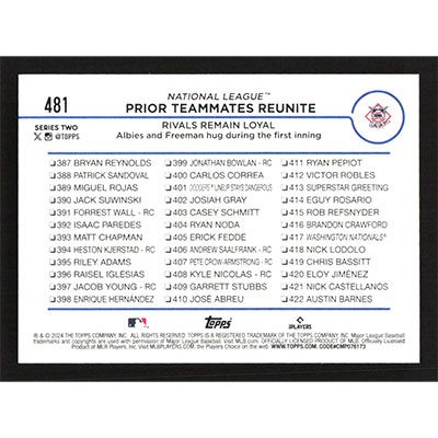 This is a 2024 Topps Ozzie Albies and Freddie Freeman Checklist Prior Teammates Reunite baseball card. The card is #481 and pictures show condition. Team(s): Atlanta Braves/Los Angeles Dodgers