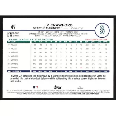 This is a 2024 Topps J.P. Crawford baseball card. The card is #49 and pictures show condition.