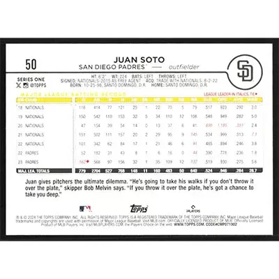 This is a 2024 Topps Juan Soto baseball card. The card is #50 and pictures show condition.