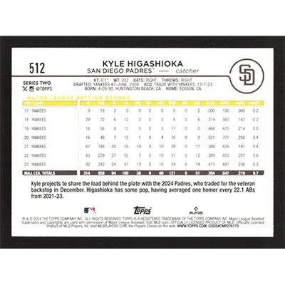 This is a 2024 Topps Kyle Higashioka baseball card. The card is #512 and pictures show condition.