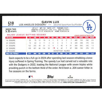 This is a 2024 Topps Gavin Lux baseball card. The card is #519 and pictures show condition.