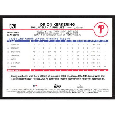 This is a 2024 Topps Orion Kerkering baseball card. The card is #520 and pictures show condition.