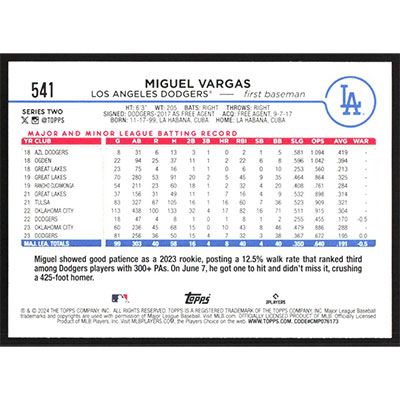 This is a 2024 Topps Miguel Vargas Future Stars baseball card. The card is #541 and pictures show condition.
