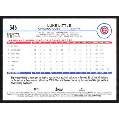 This is a 2024 Topps Luke Little baseball card. The card is #546 and pictures show condition.
