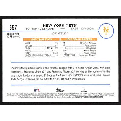 This is a 2024 Topps New York Mets Team Card baseball card. The card is #557 and pictures show condition.