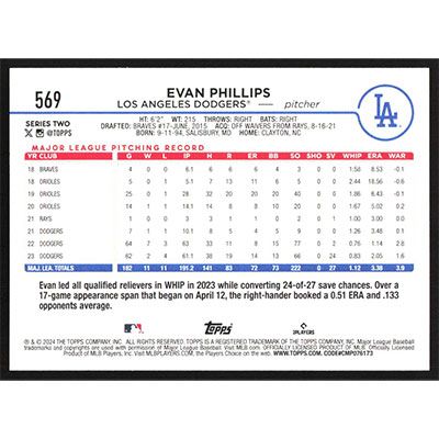 This is a 2024 Topps Evan Phillips baseball card. The card is #569 and pictures show condition.