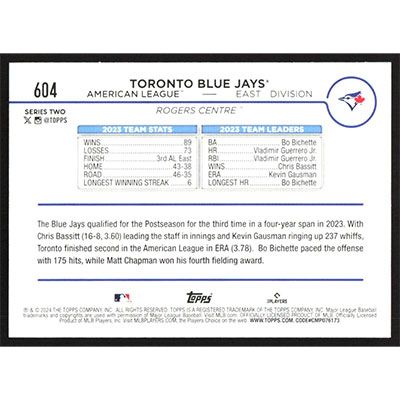This is a 2024 Topps Team Card baseball card. The card is #604 and pictures show condition.