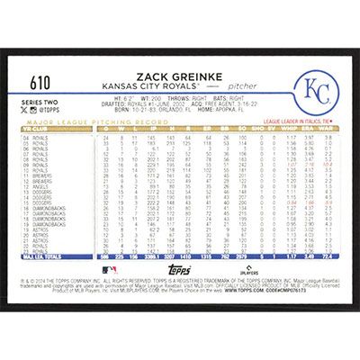This is a 2024 Topps Zack Greinke baseball card. The card is #610 and pictures show condition.