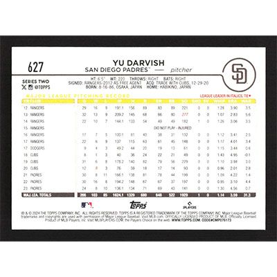 This is a 2024 Topps Yu Darvish baseball card. The card is #627 and pictures show condition.