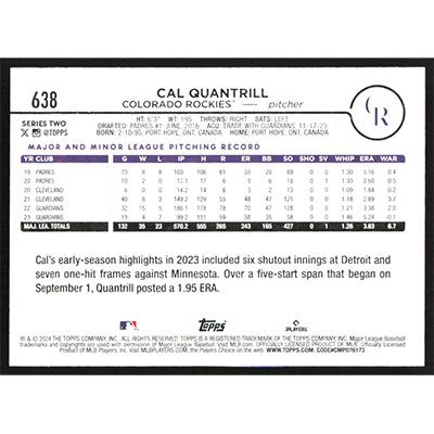 This is a 2024 Topps Cal Quantrill baseball card. The card is #638 and pictures show condition.