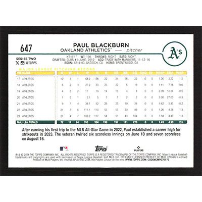 This is a 2024 Topps Paul Blackburn baseball card. The card is #647 and pictures show condition.